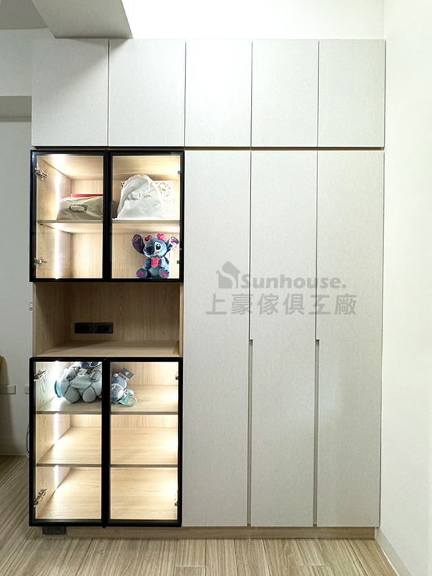 組衣櫃以兼具展示與收納為設計重點。左側設置玻璃門展示區,搭配柔光燈條,讓收藏品、香氛或配件在光影中展現溫潤質感;右側則為門片式衣櫃,隱藏日常衣物與生活用品,維持整體整潔俐落。