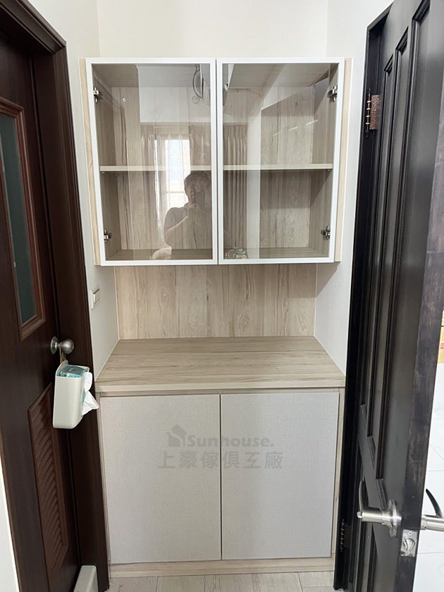 建商附的廚具,收納空間有限,業主增加了這座餐櫃,除了可以收納許多廚房用品,
