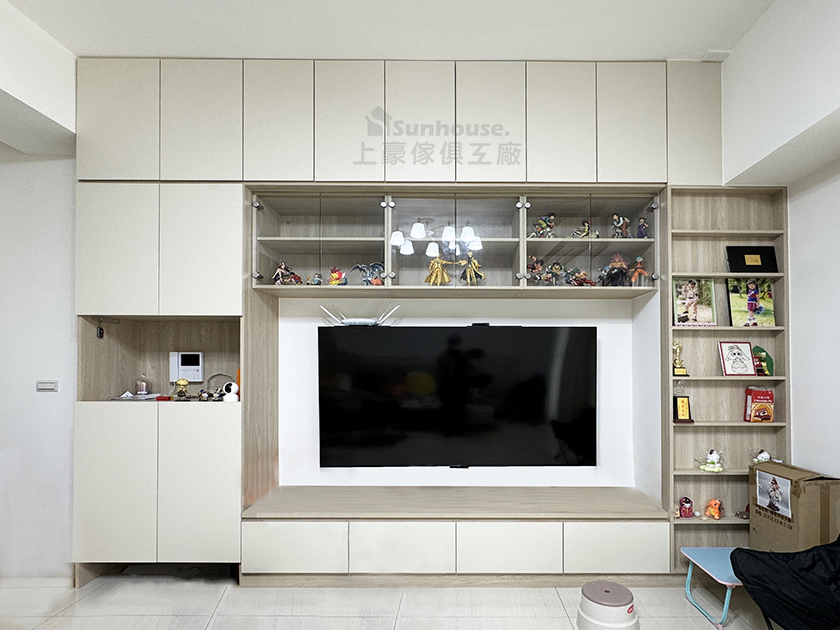 整片收納電視牆,除了包覆上方樑柱外,還要展示公仔.最右邊剛好剩餘薄薄的空間,也可以拿來展示相片.