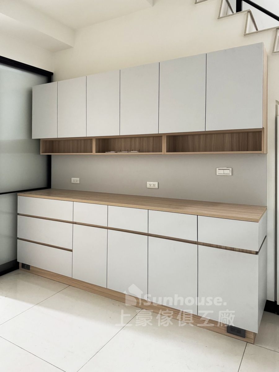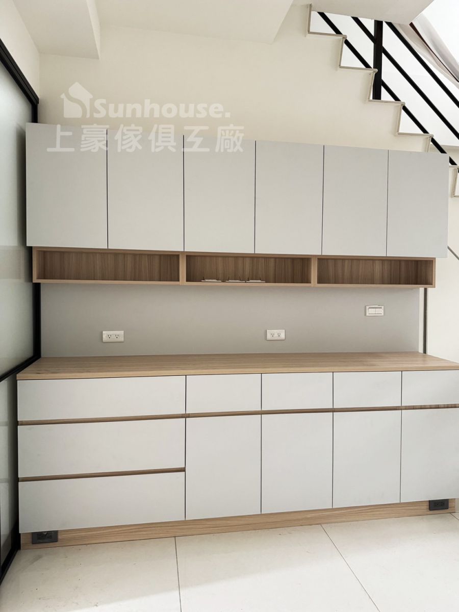 除了客廳空間之外,本案同樣重視廚房在日常生活中的使用頻率與實際機能,將「收納效率」與「操作流暢度」作為規劃核心。設計初期即依屋主實際下廚習慣與家電配置需求,量身規劃專屬的廚房系統收納櫃,整合電器櫃、高櫃與下櫃配置,使家電、食材與餐具各自歸位,讓料理流程更加順暢。